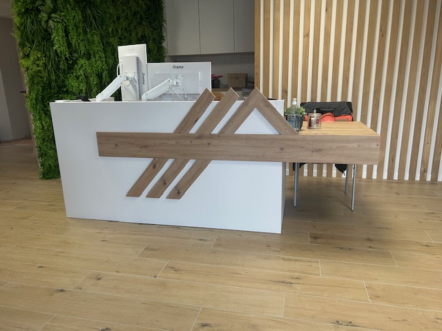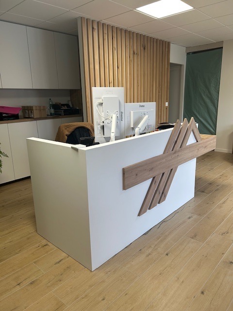 Fourniture et pose d’une banque d’accueil en stratifié blanc mat, avec plan de travail intégré, caisson roulant, éléments décoratifs personnalisés et claustra bois, alliant design et fonctionnalité.